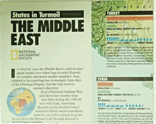 MAP OF STATES IN TURMOIL THE MIDDLE EAST 1991 NATIONAL GEOGRAPHIC MAGAZINE SUPPL