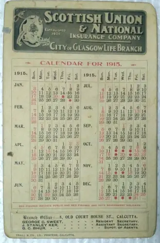 INDIA VINTAGE - SCOTTISH UNION & NATIONAL INSURANCE COMPANY ADVERT,CALENDAR 1915