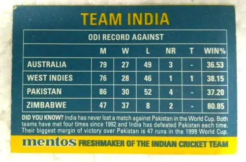 INDIA MENTOS NATWEST SERIES AT LORDS CRICKET CARD TEAM INDIA