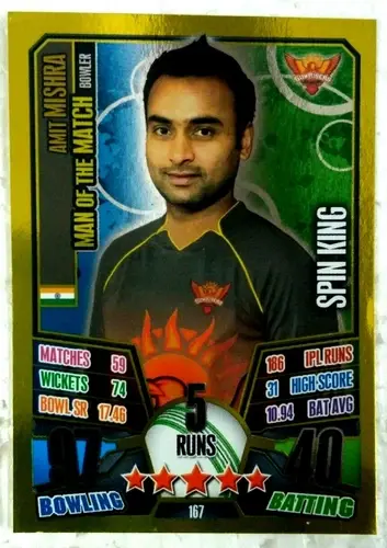 INDIA IPL TOPPS 2013 CRICKET ATTAX GOLD CARD AJINKYA RAHANE MAN OF THE MATCH