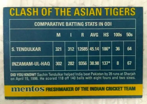 INDIA MENTOS CLASH OF ASIAN TIGERS CRICKET CARD SACHIN TENDULKAR V/S IMZAMAM