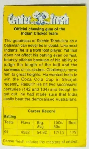 INDIA RARE CENTRE FRESH CRICKET TRADING CARD SACHIN TENDULKAR WITH DATA