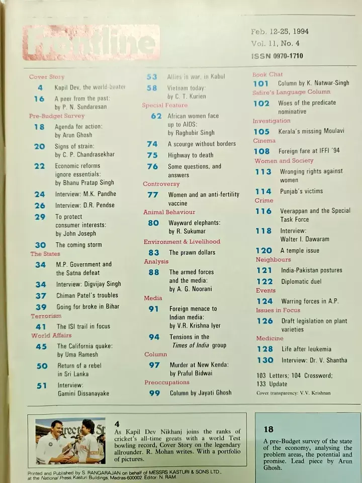 INDIA FRONTLINE MAGAZINE 1994: KAPIL DEV WORLD RECORD HOLDER, PUNJAB'S VICTIM