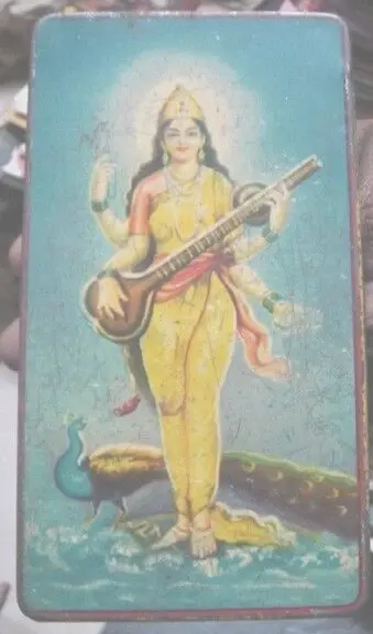 INDIA VINTA TIN BOX HINDU GODDESS SARSWATI OF KNOWLEDGE, MUSIC, LEARNING, ART