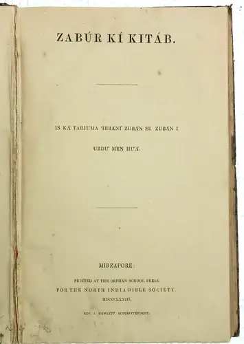 INDIA VINTAGE 1873 ZABUR KI KITAB, ISKA TARJUMA IBRANI ZUBAN SE ZUBAN I URDU MEN