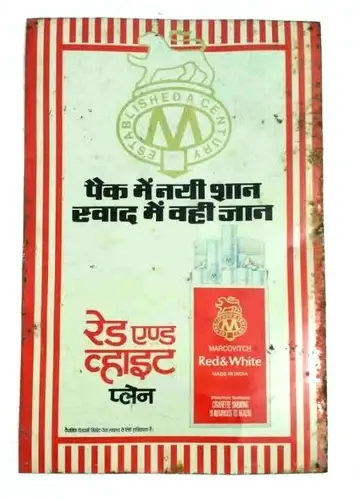 INDIA VINTAGE MARCOVITCH RED & WHITE CIGARETTE ADVERTISEMENT TIN BOARD